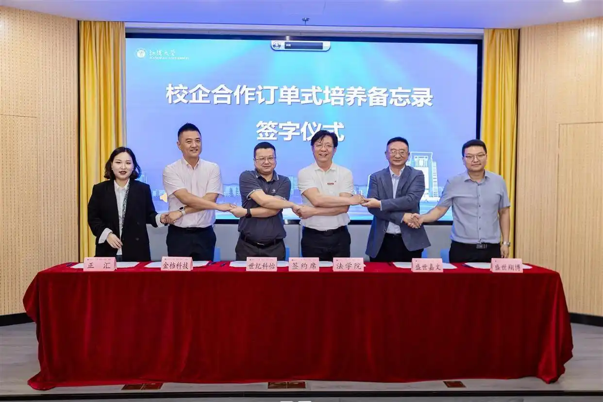 活动现场,江汉大学与多家档案服务企业签订订单式培养合作备忘录,市档案局向法学院赠书。现场氛围庄重热烈,彰显了政校企携手共育人才的坚定决心与广阔前景。武汉世纪科怡科技发展有限公司副总经理刘宝雄、武汉盛世嘉文科技有限公司总经理杨文健表示,合作备忘录的签署不仅推动产学研深度融合,也为学生走进行业、对接实践搭建了重要平台。企业将主动参与人才培养全过程,协同制定课程标准,开放真实业务场景,提供岗位实训和项目指导,推动“课堂——行业”紧密衔接,形成订单式培养机制,助力学生在学习中提升能力、在实践中实现成长。