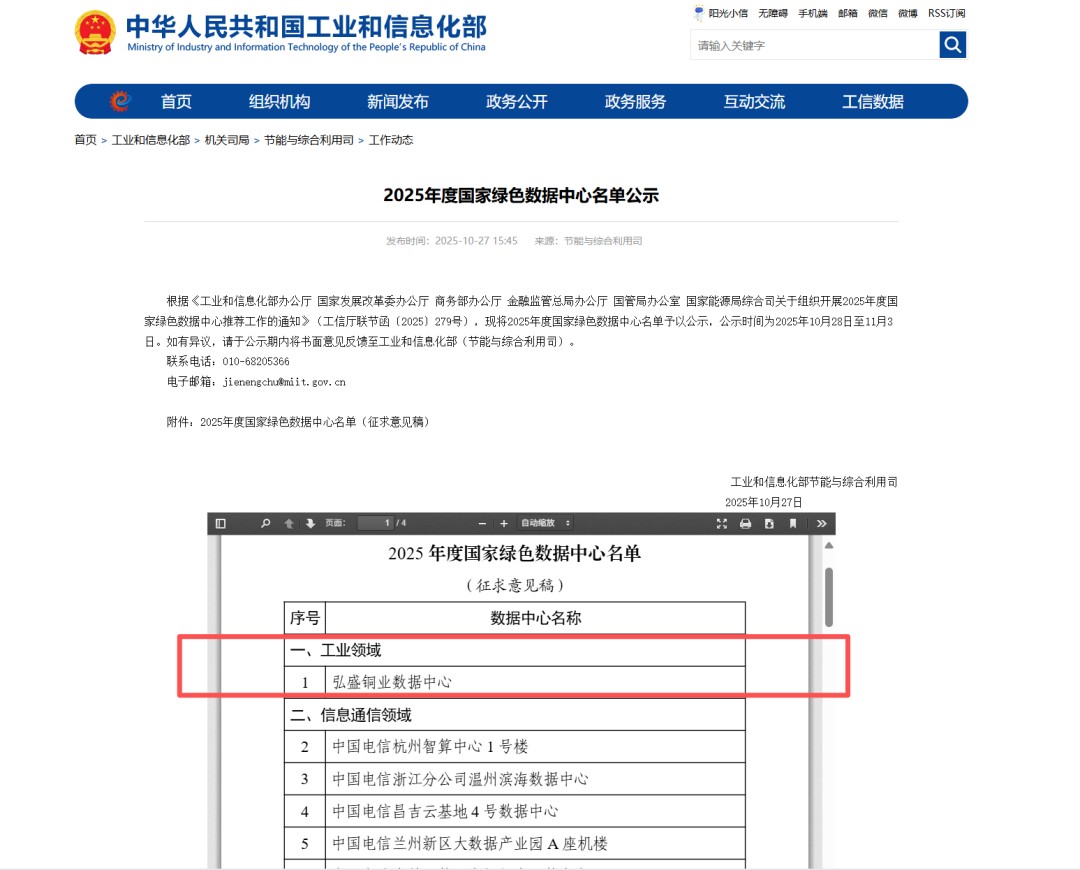 近日,工业和信息化部发布“2025年度国家绿色数据中心”名单,弘盛铜业数据中心榜上有名,是本次工业领域的唯一入选者。这是中色大冶弘盛铜业锚定绿色智能航向,以绿色发展为引擎、以智能制造为动能,交出的一份彰显社会责任和发展实力的亮眼答卷。